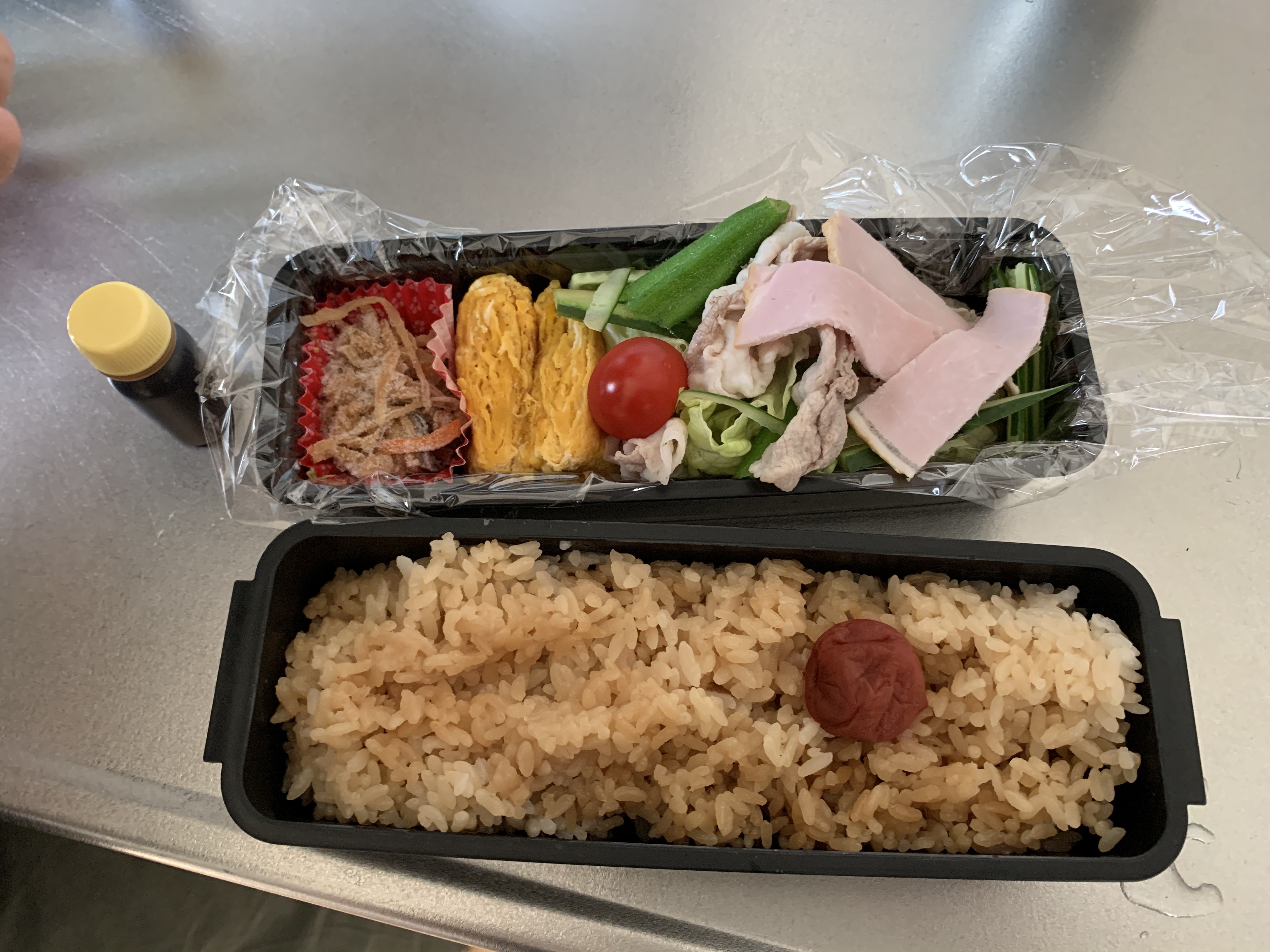 前日の冷しゃぶの残りと卵焼き、冷食きんぴら、焼豚作ったたれで炊き込みご飯。