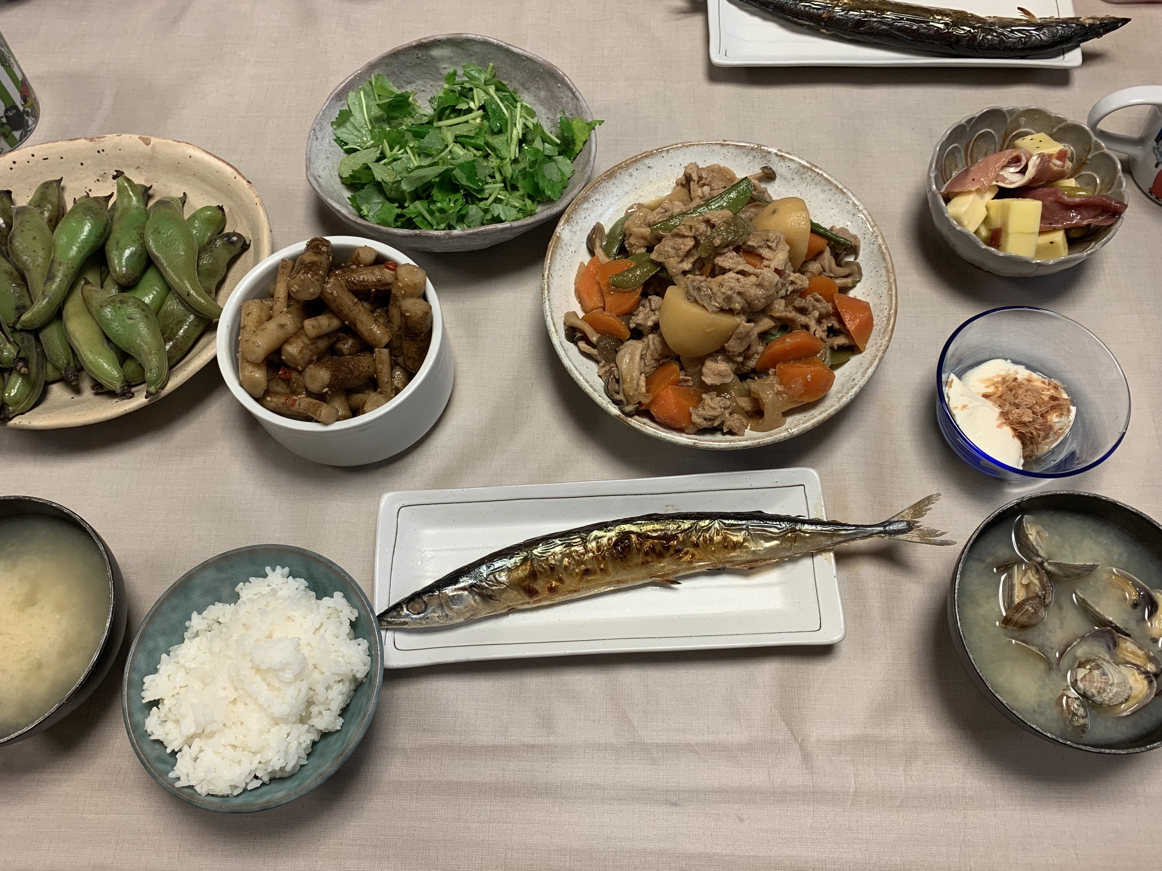 夕飯は、肉じゃが、焼きそら豆、さんま丸干し、みつばサラダ、冷奴、たたきごぼう。