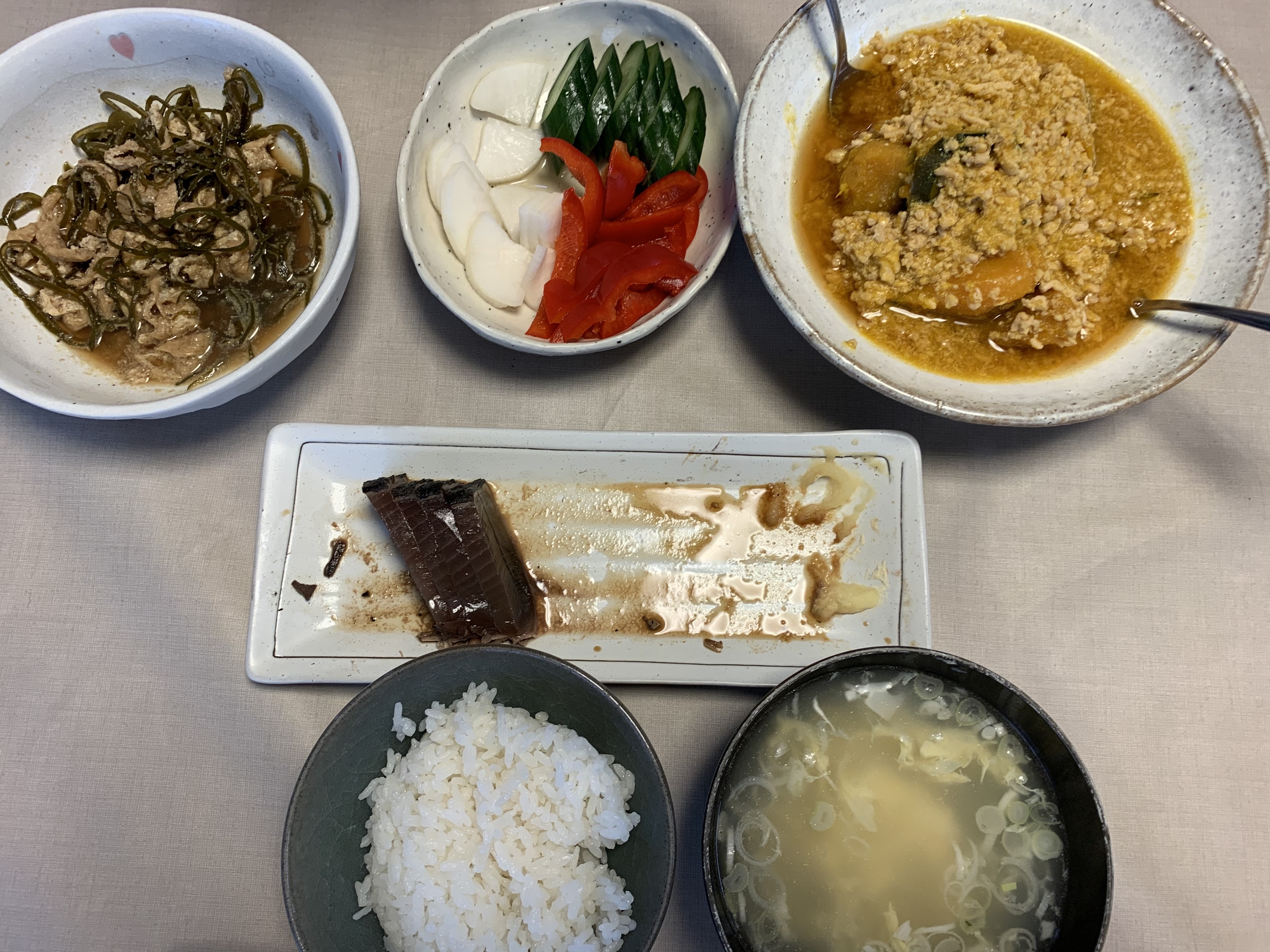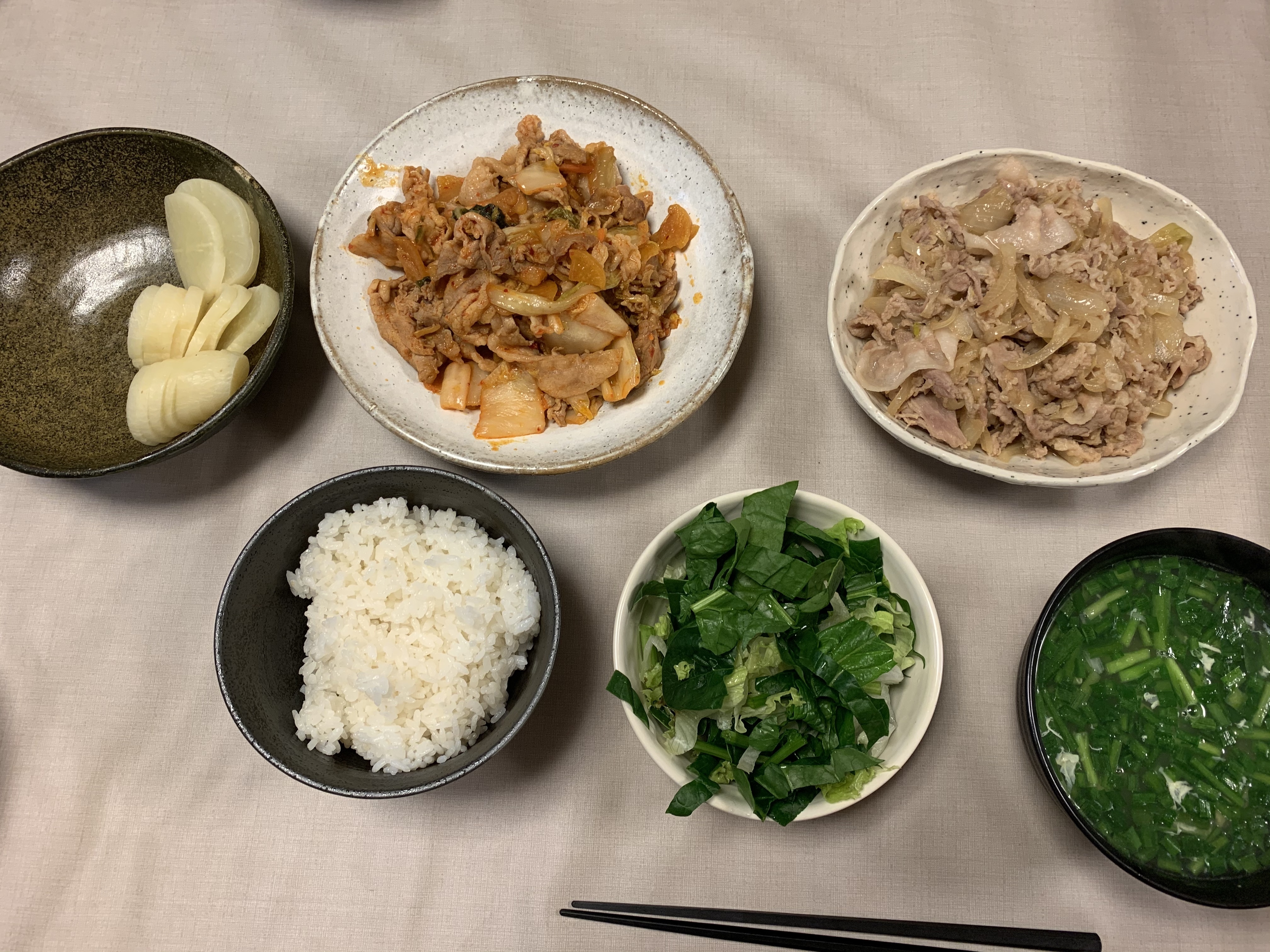 夕飯ひ、豚キムチ、生姜焼き、サラダ、ニラ玉豆腐スープ。