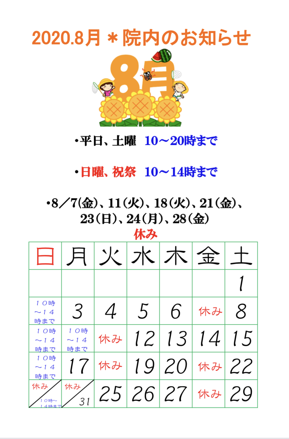 ・8/7(金)、11(火)、18(火)、21(金)、23(日)、24(月)、28(金) 休み