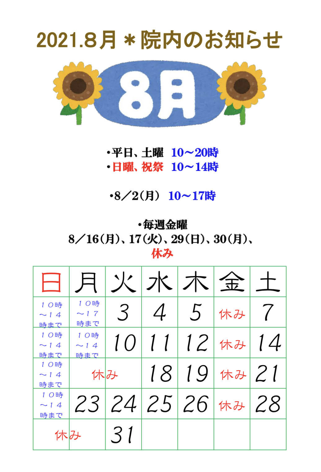 さて、8月の院内のお知らせです。