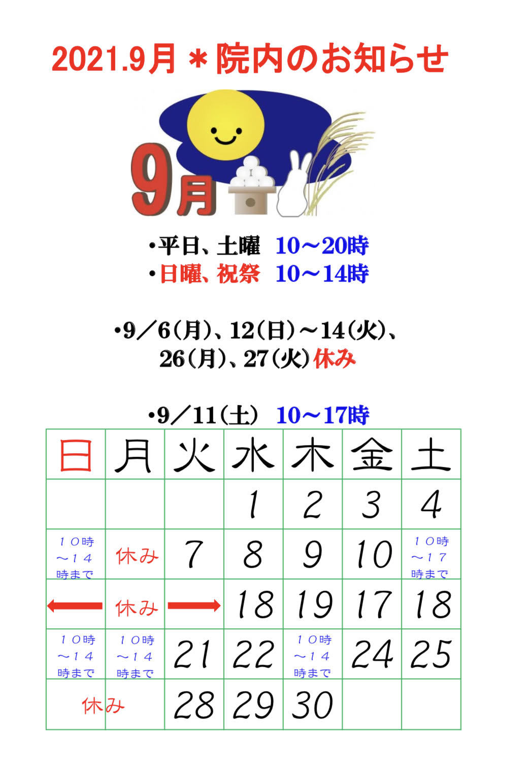 ・9/6(月)、12(日)~14(火)、26(日)、27(月)休み