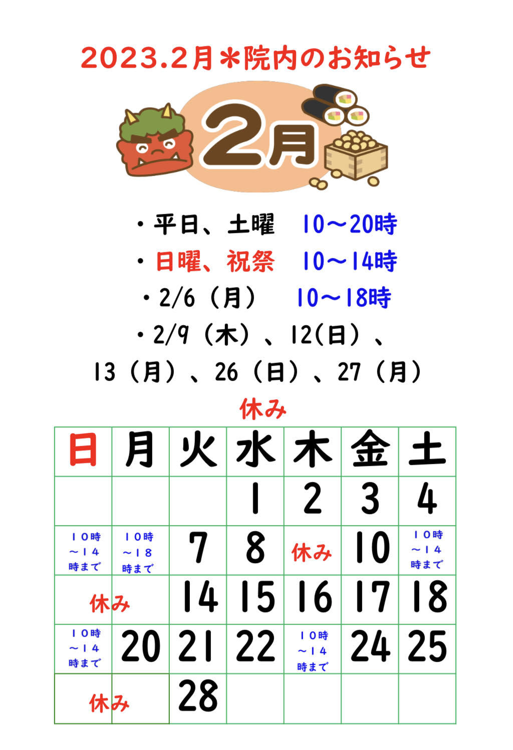 ・2/9(木)、12(日)、13(月)、26(日)、27(月) 休み