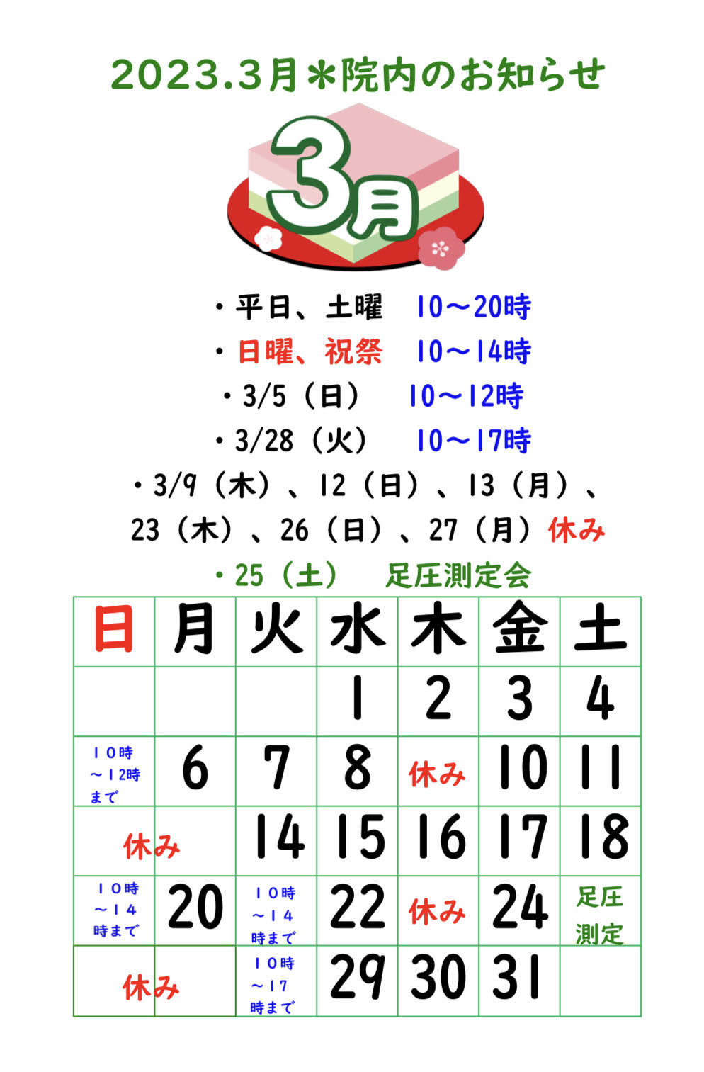 ・3/9(木)、12(日)、13(月)、23(木)、26(日)、27(月) 休み