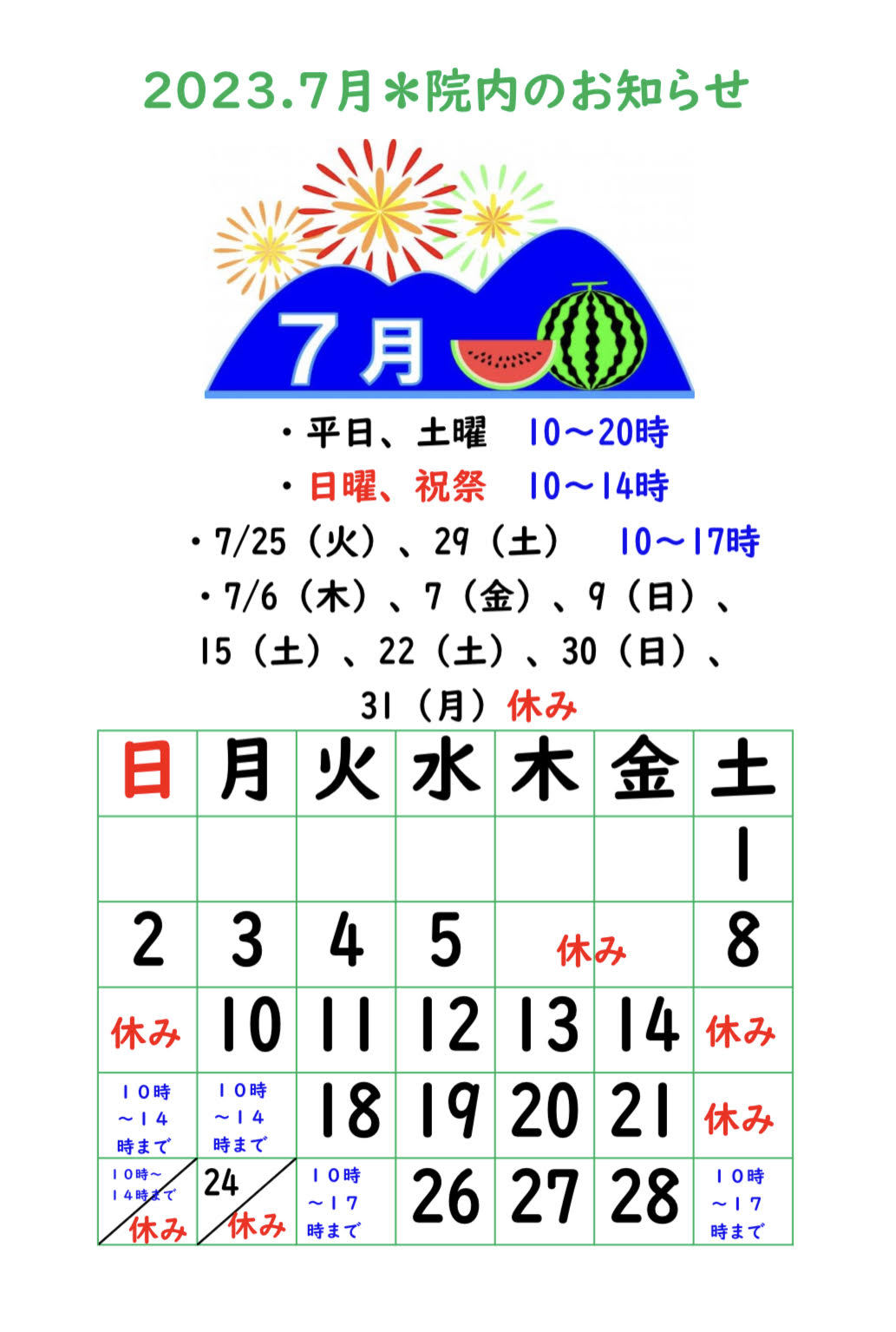 ・7/6(木)、7(金)、9(日)、15(土)、22(土)、30(日)、31(月) 休み