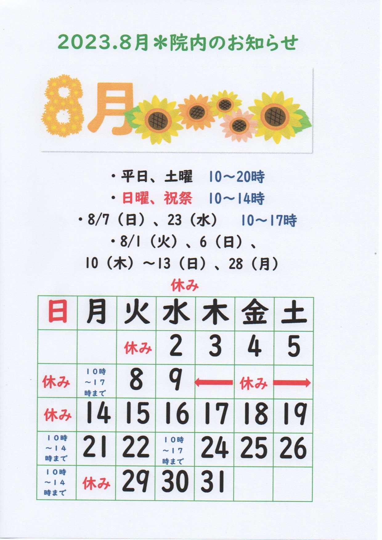 ・8/1(火)、6(日)、10(木)~13(日)、28(月) 休み