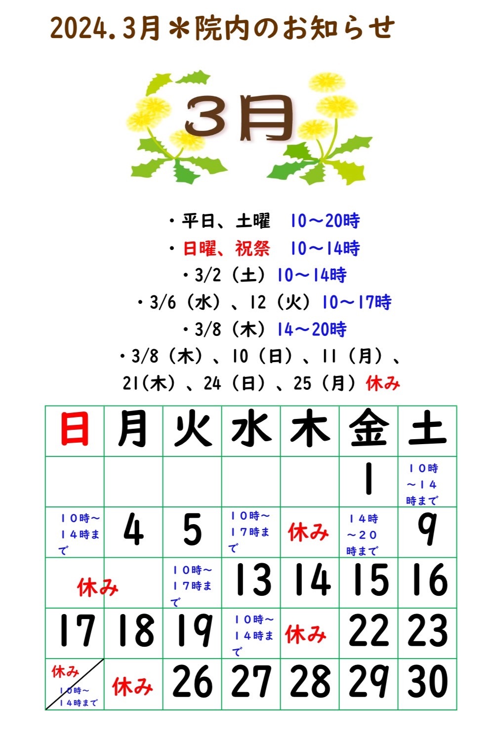 ・3/7(木)、10(日)、11(月)、21(木)、24(日)、25(月) 休み