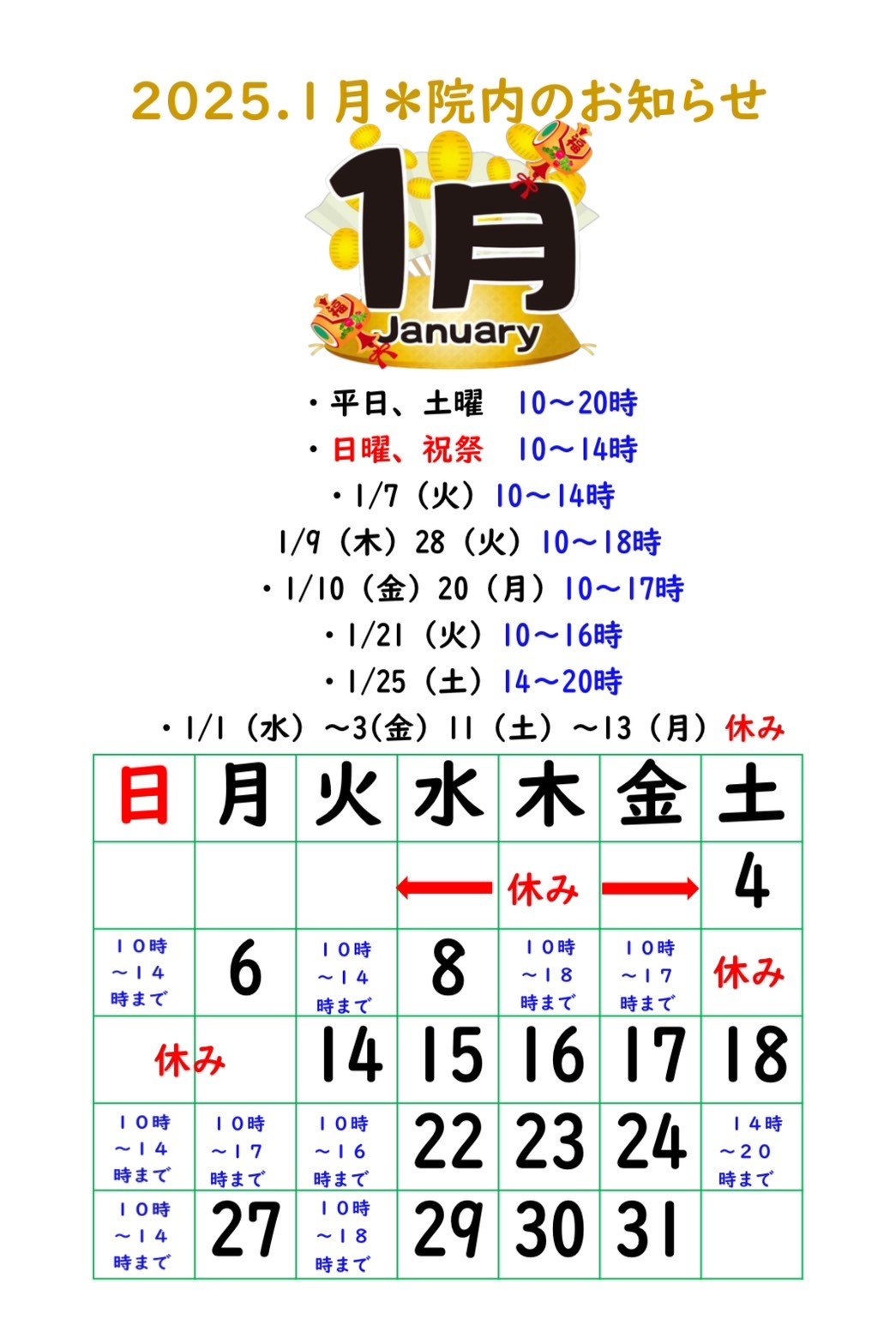 さて、1月の院内のお知らせです。