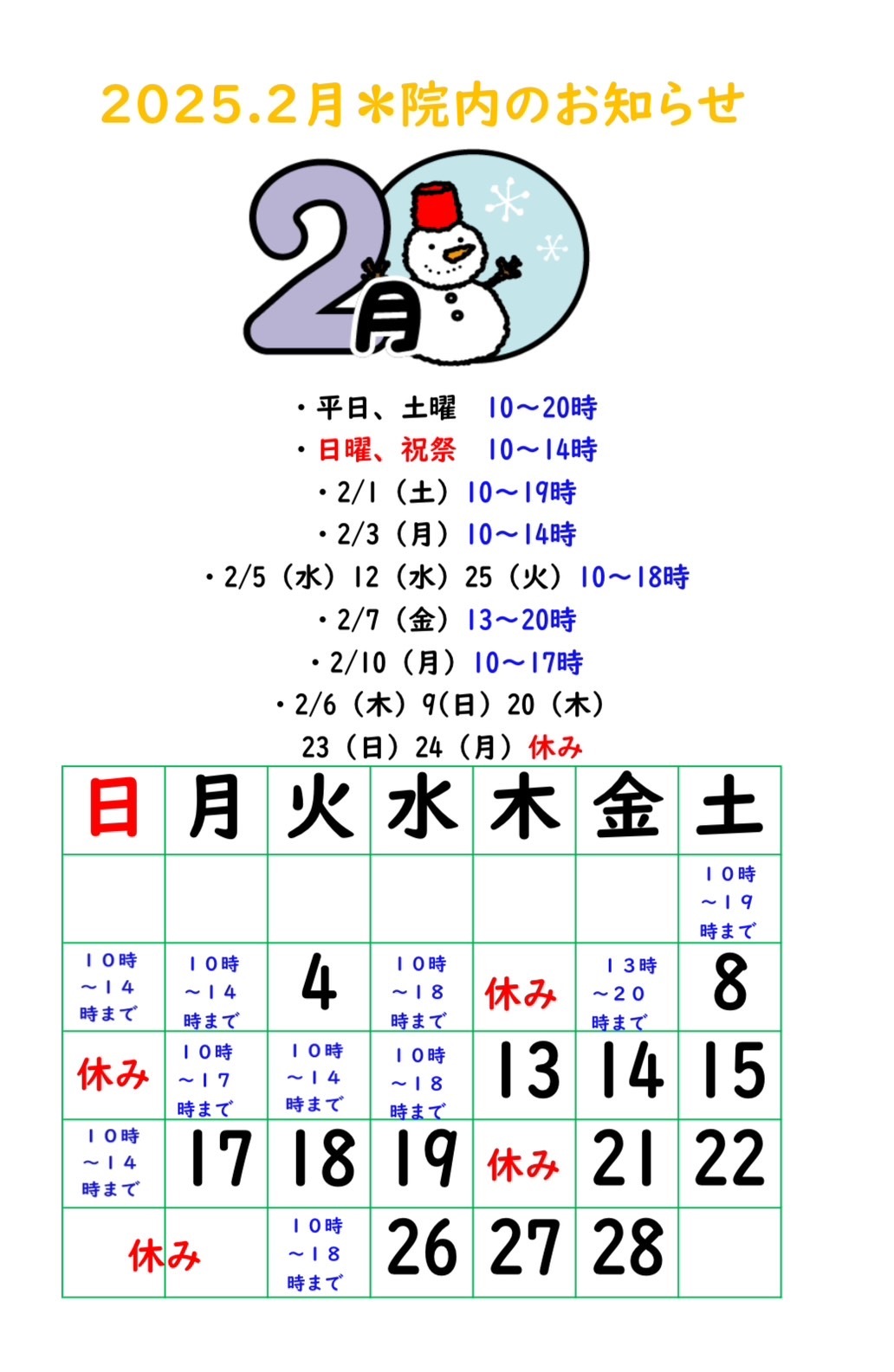 ・2/6(木)9(日)20(木)23(日)24(月) 休み