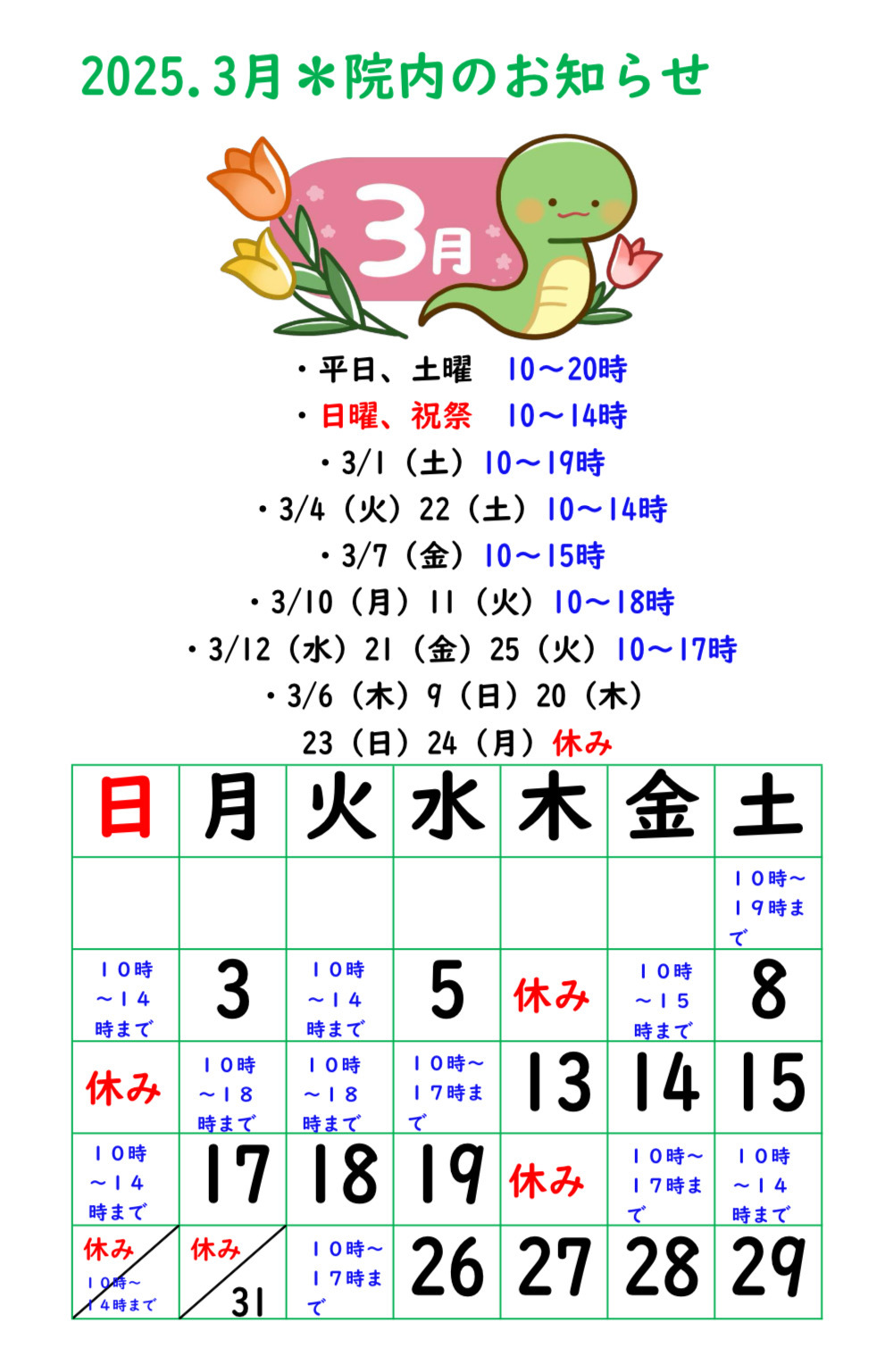 ・3/6(木)9(日)20(木)23(日)24(月) 休み