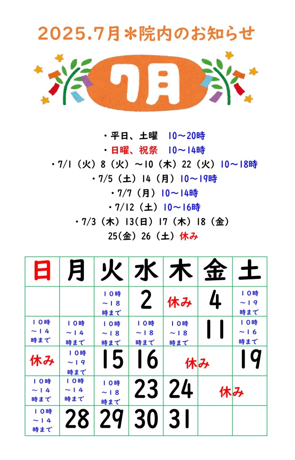 ・7/3(木)13(日)17(木)18(金)25(金)26(土) 休み